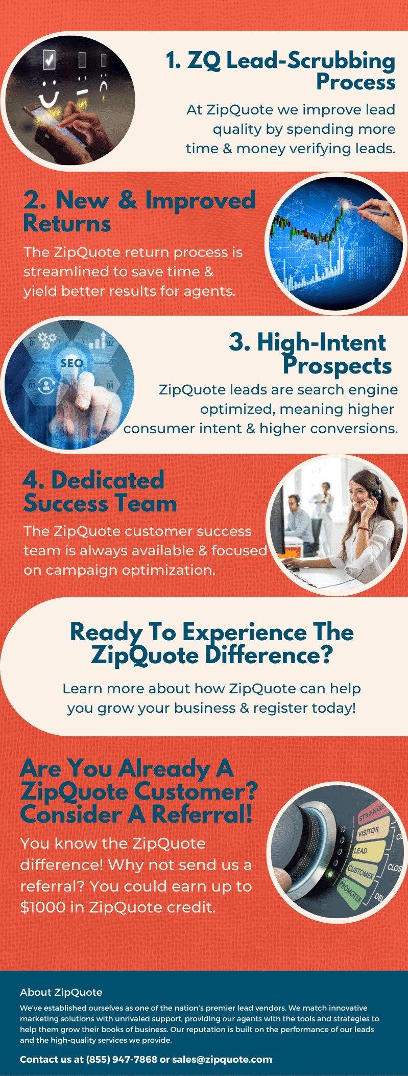 With ZipQuote, agents have a partner committed to their success. We understand that when it comes to lead generation, it’s all about convenience and making the process as seamless as possible. Our agent-focused approach means we constantly improve our products and services to offer the most comprehensive solutions to agents and their teams. When you partner with ZipQuote, you can expect the assistance of a knowledgeable team of professionals who want to see you succeed and have a track record built on sustained value.